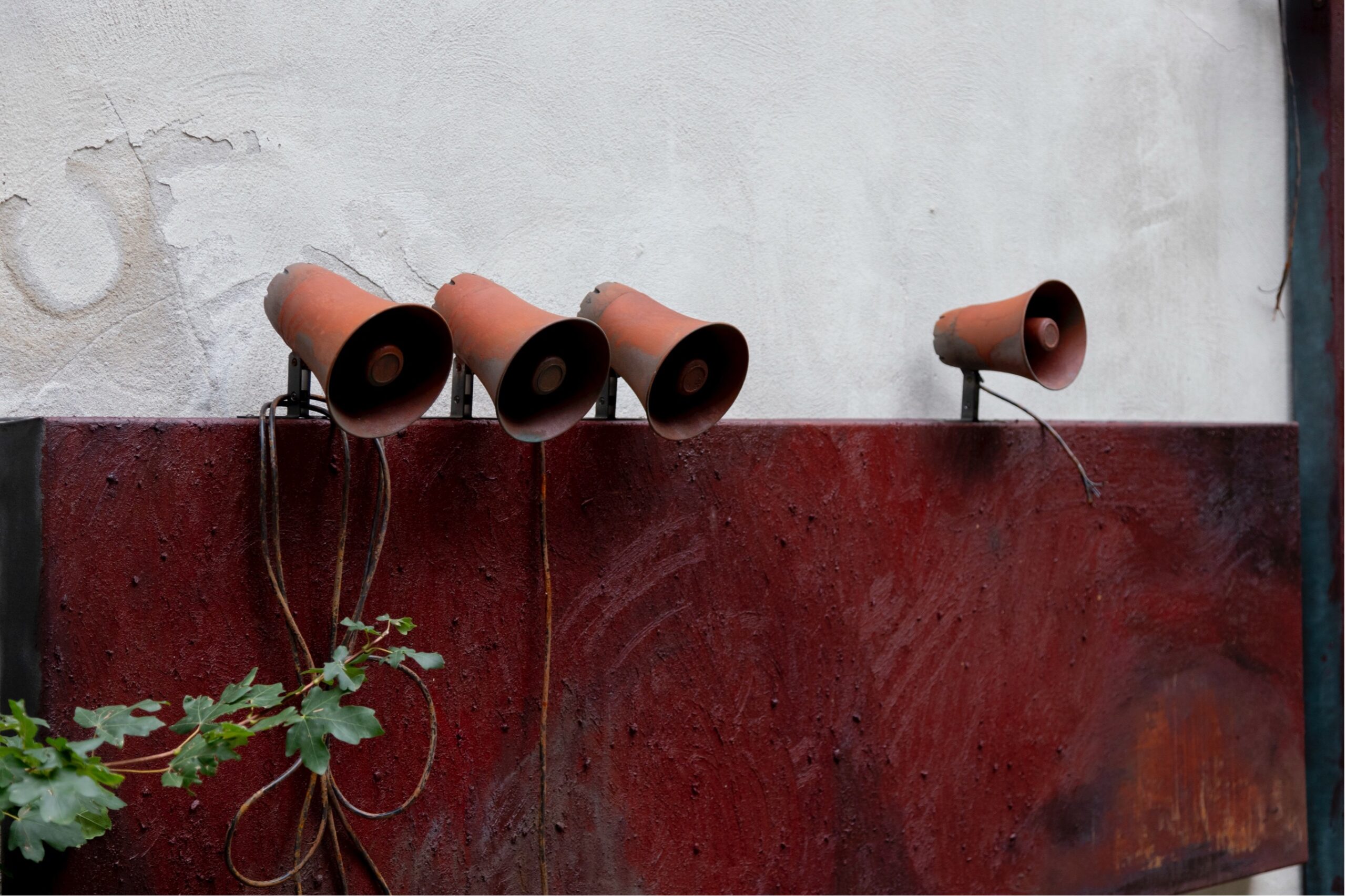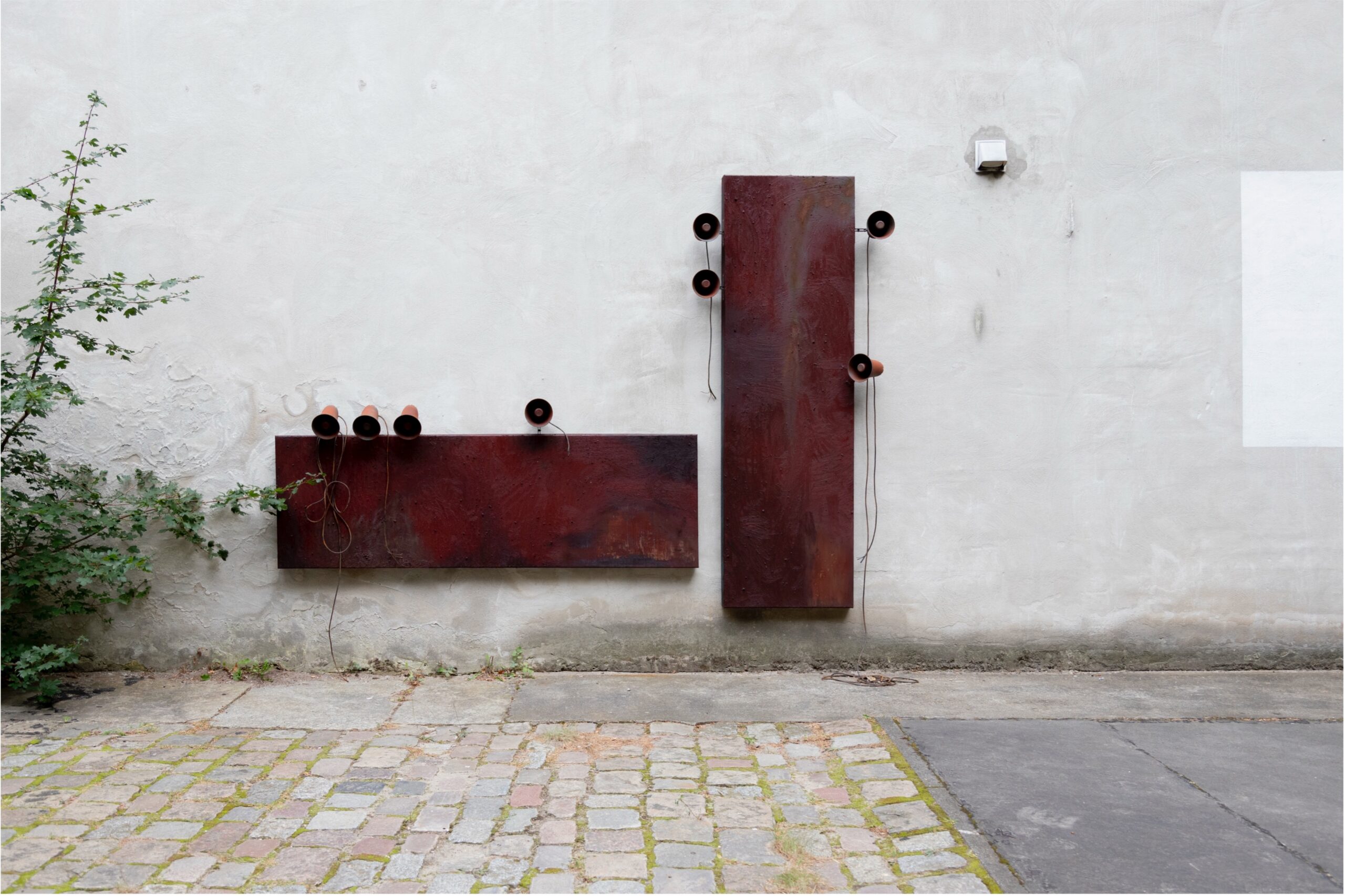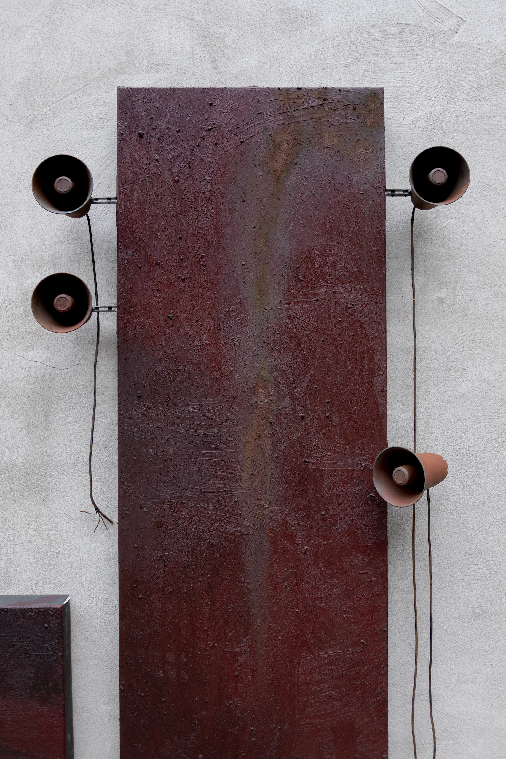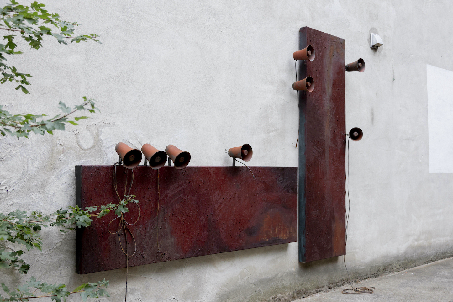 Since their introduction, loudspeakers have been an object of contention. Across the subcontinent and beyond they are used to emit calls to prayer and amplify sermons, and many temples and mosques are now equipped with loudspeakers. Demands are often made for Indian Muslims to emit the azzan or call to prayer in “a low voice” so as not to disrupt public life. the low voice draws together questions of erasure and political speech, as well as the relationship of sound to space and propinquity, by linking the Muslim and the Dalit subject. Voice has traditionally been associated with the rational human – the one who is capable of speech – as well as political presence and power. Conversely, the idea of the “low”, hushed, or unobtrusive voice is often linked to the subordinate and the subhuman; the one who is incapable of speech and articulation. These two works – composed of oil paint, cow dung, and iron powder, and affixed with loudspeakers – connect the ongoing erasure of the Muslim past and present in India, and the sustained violence faced by Dalits and lower castes, through the idea of the inaudible. The works reflect on what kind of presence might exist in the absence of audible sound.